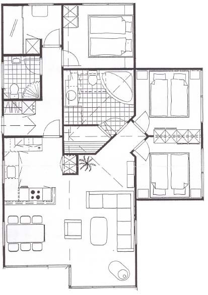 Schlafräume: 3 Zimmer mit Doppelbetten, 1 Zimmer mit 1 Bett.