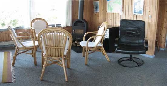 Wohnzimmer: Kaminofen, Stereoradio, Farb-TV und Parabol